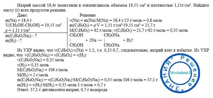 Натрий массой 18,4г поместили в этиленгликоль объемом 19,55 см³ и плотностью 1,11г/см³. Найдите массу (г) всех продуктов реакции.