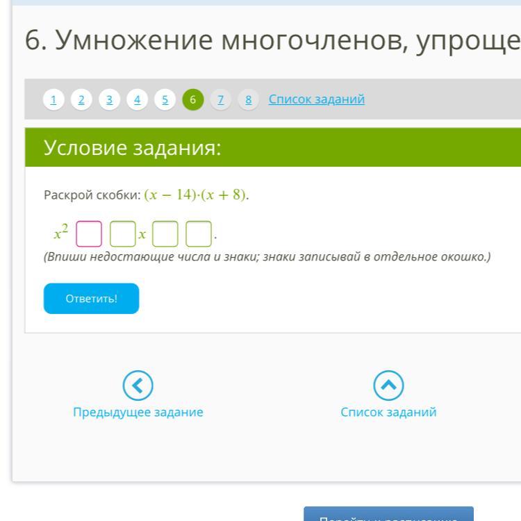 (х - 14) * (х + 8) = х^2 - 14x + 8x - 112 = х^2 - 6x - 112