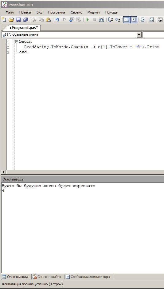 ReadString.ToWords.Count(c -> c[1].ToLower = 'б').Print