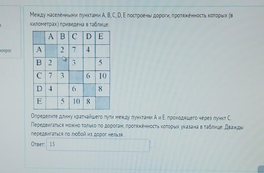 То есть куда тебе нужно из серой клетки попасть в другую серую. Например из А в пункт B, ты уже проехал 2км. Далее смотришь по горизонтали куда можно поехать. Ты видишь 3км (в столбике С) и 5км (в столбике E). Например выбираешь С и спускаешь на серую клетку. Далее от неё смотришь 6 (столбик D) и 10 (столбик E). Дальше так же выбираешь и спускаешься, но это я на пример показал длинный путь. Самый кратчайший я написал под правильным ответом.