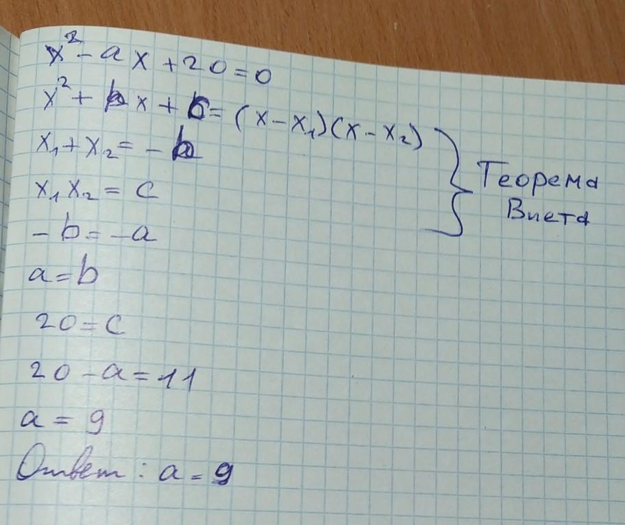 Найти все значения параметра а, при которых сумма корней квадратного уравнения x^2-ax+20=0 на 11 меньше их произведения. Нужно очень хорошее и подробное объяснения, почерк осень важен.
