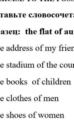 Поставьте словосочетание в претежательном словосочетание 1. the address of my friend 2. the stadium of the country 3. the books of children 4. the clothes of men 5. the shoes of women