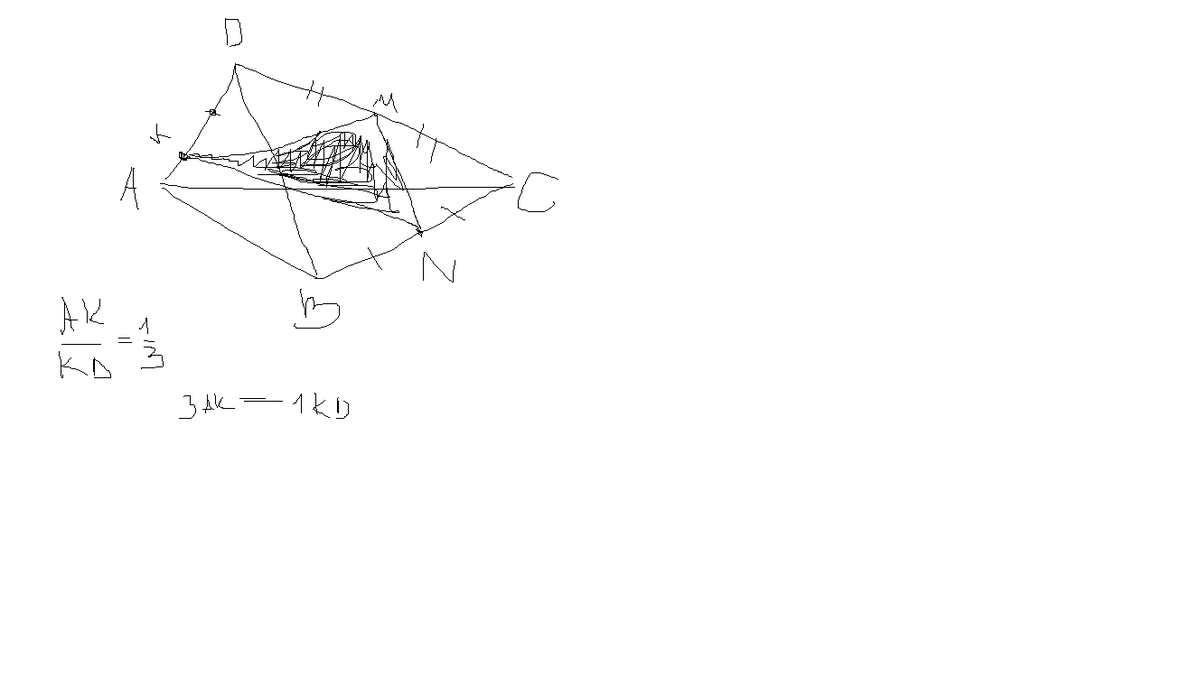 Изобразите тетраэдр DABC и постройте его сечение плоскостью, проходящей через точки M и N, являющиеся серединами ребер DC и BC, и точку K, такую, что K принадлежит DA,а АK : KD = 1 : 3 Очень важно!РИСУНОК ОБЯЗАТЕЛЬНО!