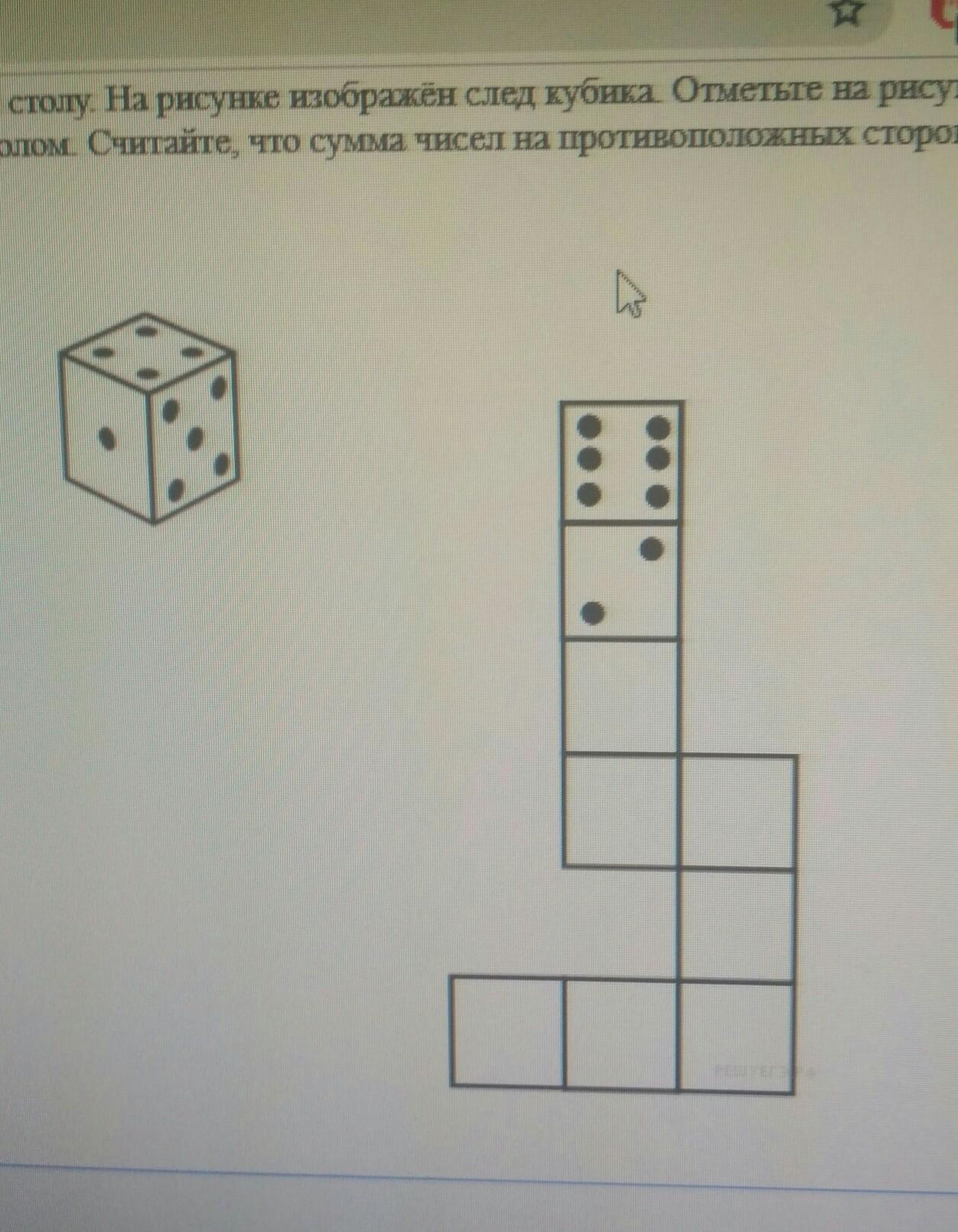 СРОЧНО НУЖНО ДАЮ 30 БАЛЛОВ!!!!игральный кубик прокатили по столу на рисунке изображён след кубика отметьте на рисунке место в котором грань с тремя точкой соприкасалась со столом считаете что сумма чисел на противоположных сторонах кубика равна 7.
