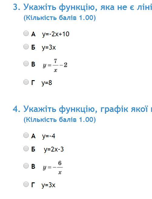 ПОМОГИТЕ ПОЖАЛУЙСТА ДАЮ 25 баллов Укажіть функцію, яка не є лінійною. Укажіть функцію, графік якої проходить через початок координат.
