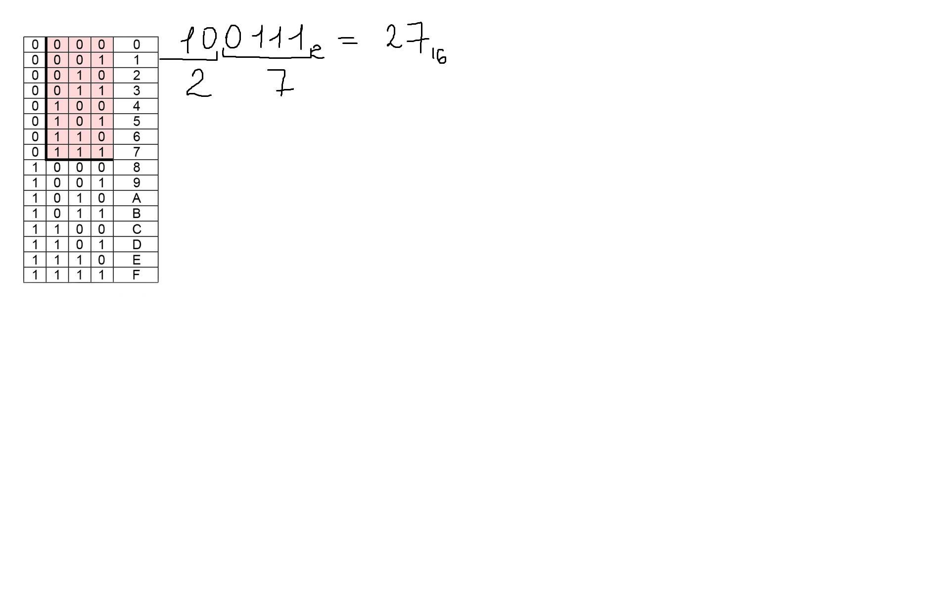 По таблице тетрад у шестнадцатиричных чисел 4 цифры, ищем по таблице сначала 0111, потом 10, в итоге подставляем и получается 27