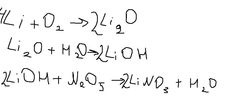 Li → Li2O → LIOH → LINO3 ( там где 2 и 3, это индексы которые стоят внизу)