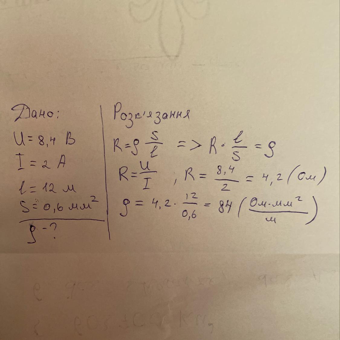 . Для виготовлення спіралі взяли 12 м дроту площею поперечного перерізу 0,6 мм2.З якого матеріалу виготовлений дріт, якщо при силі струму в спіралі 2 А напруга на її кінцях становить 8,4 В?