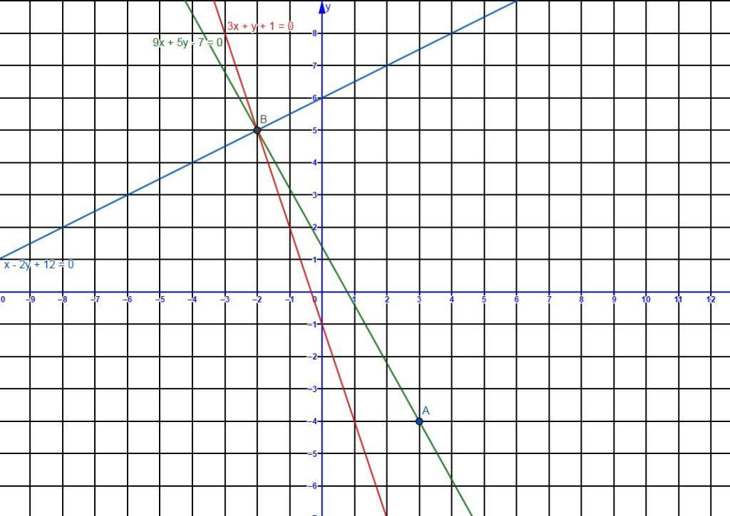 через точку пересечения прямых x-2y+12=0, 3x+y+1=0 и точку A(3,-4) проведена прямая.составьте ее уравнение.сделайте чертеж.