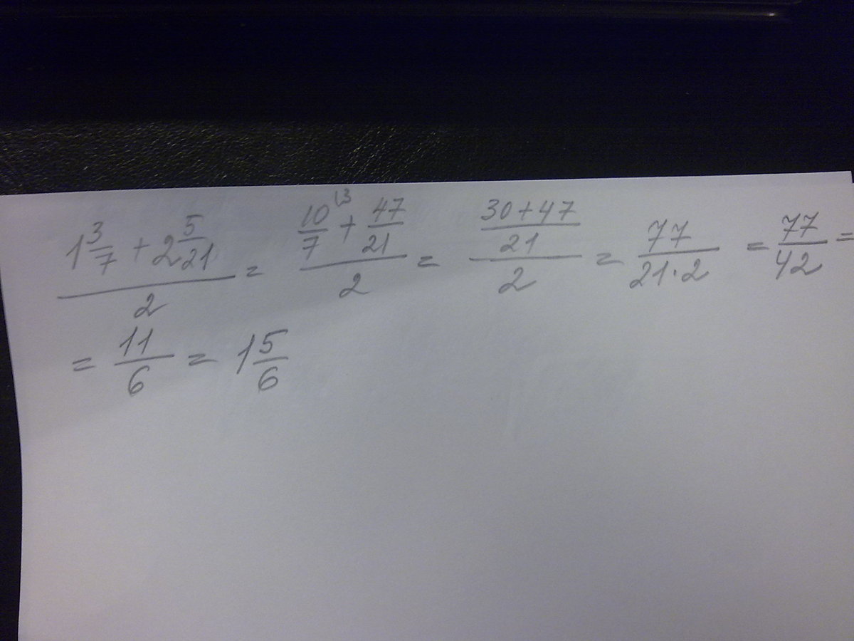 (1 3/7+2 5/21):2=(10/7+47/21):2=(30/21+47/21):2=77/21 *1/ 2=77/42=1 35/42=1 5/6среднее арифметическое