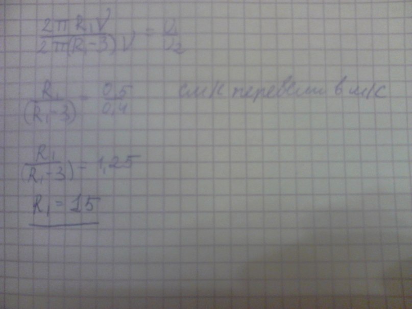 Линейная скорость точек обода вращающегося колеса равна 50 см/с, а линейная скорость точек, находящихся на 3 см ближе к оси вращения, равна 40 см/с. Определить радиус колеса. по конкретней объсните пжл