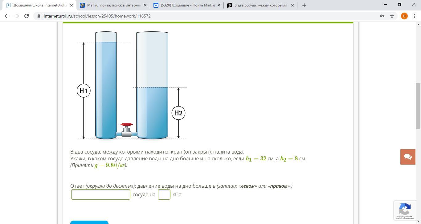 В левом колене давление больше, т.к. уровень воды выше, на величину