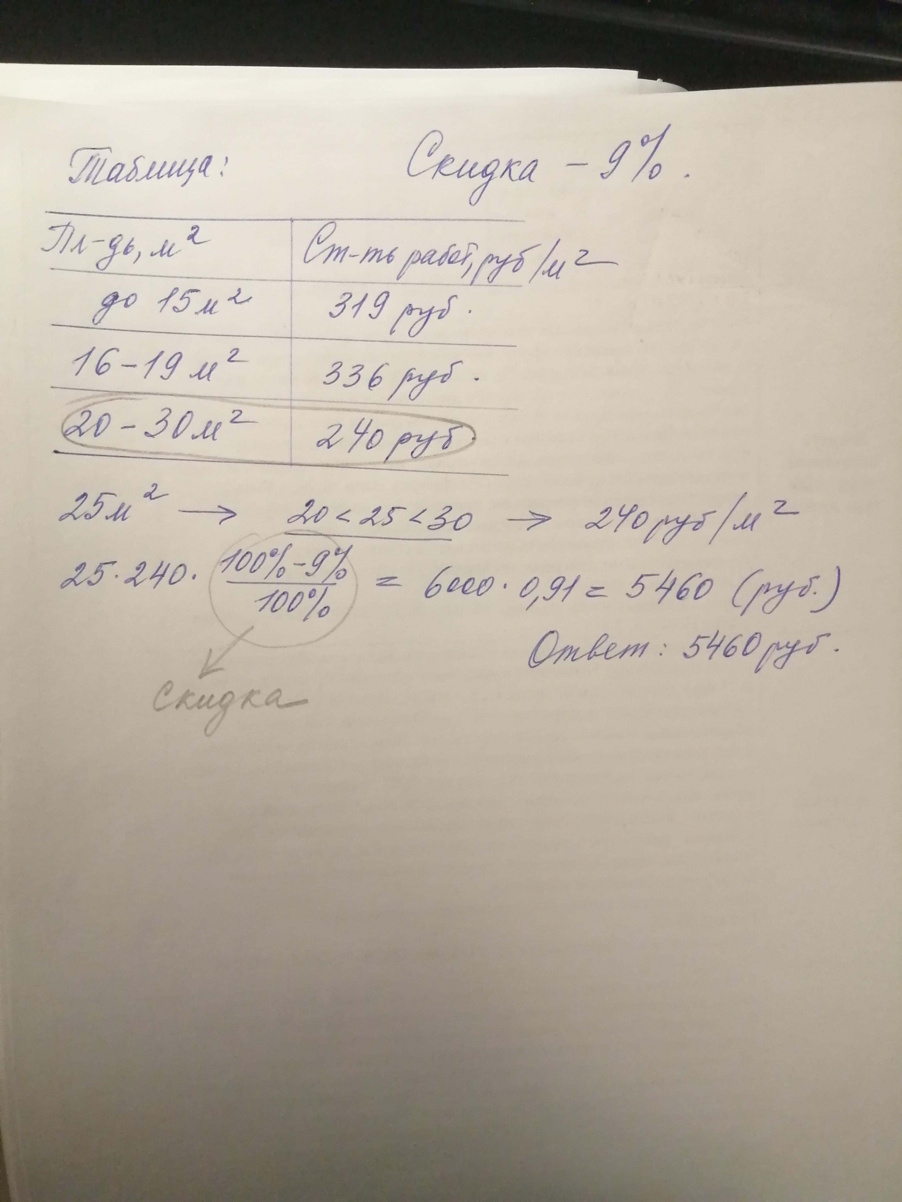 Определи стоимость работ, если на момент заказа действует скидка 9 %.