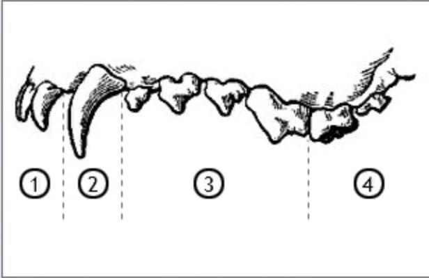 Укажите, как называются разные типы зубов у млекопитающих (на примере зубов верхней челюсти волка).