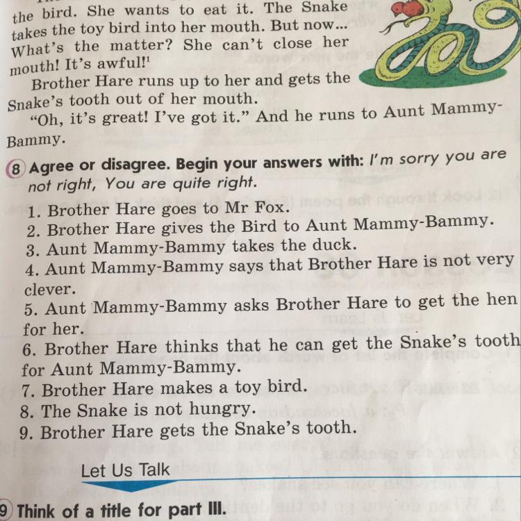 6 Whose tooth can Brother Hare get, according to his thinking, for Aunt Mammy-Bammy?(Snake's)