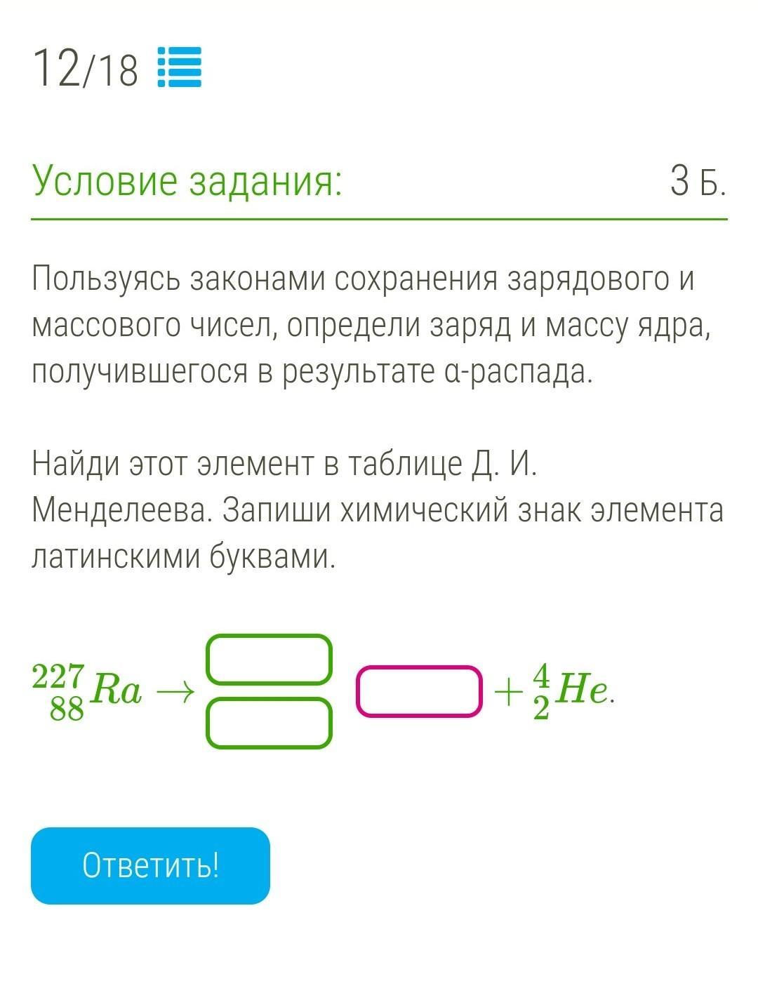 Найди этот элемент в таблице Д. И. Менделеева. Запиши химический знак элемента латинскими буквами.