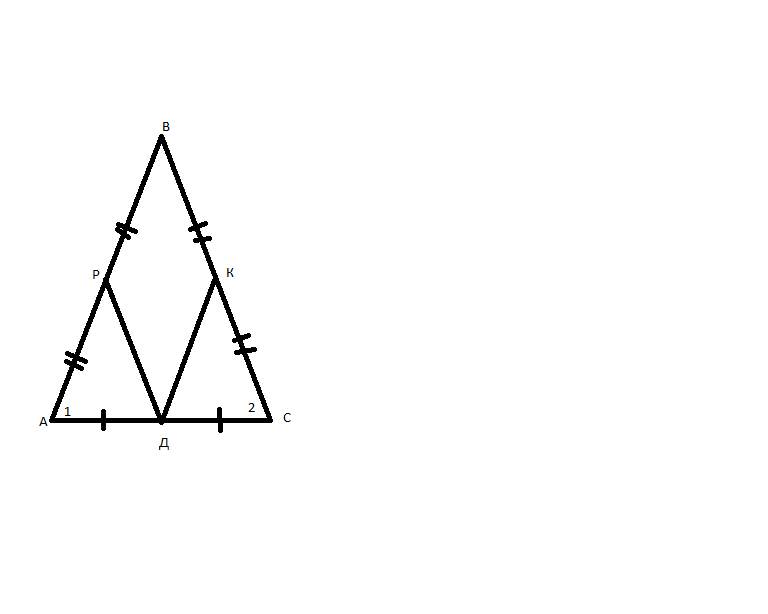 треугольник АРД=треугольникуДКС по 1 признаку (АД=ДС по условию, АР=СК т.к. это половины равных сторон АВ и ВС, т.к. треугольник равнобедренный, угол1=углу2 т.к. углы при основании равнобедренного треугольника равны).
