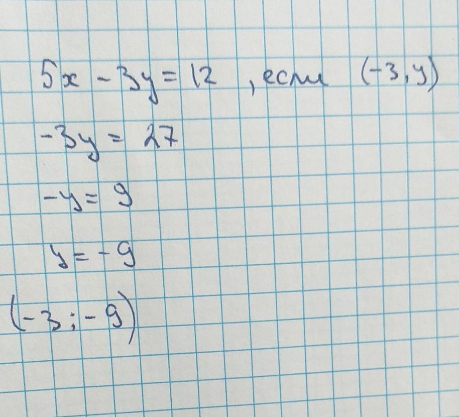 Объяснение: т.к нужно найти y,а -3 это абсцисса,мы можем 5 умножить на - 3 это будет -15 и еще вычесть -3у это будет 12 так как отрицательное на положительное будет положительное и мы получаем 27((12+12)= 24 и + 3 )) и 27 / 3 получаем 9 все вроде бы