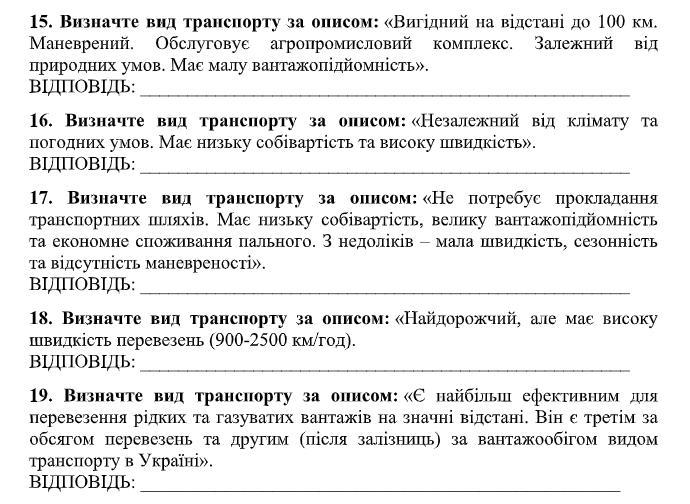 15. визначте вид транспорту за описом: "Вигідний на відстані до 100 км. Маневрений. Обслуговує агропромисловий комплекс. Залежний від природних умов. Має малу вантажопідйомність".