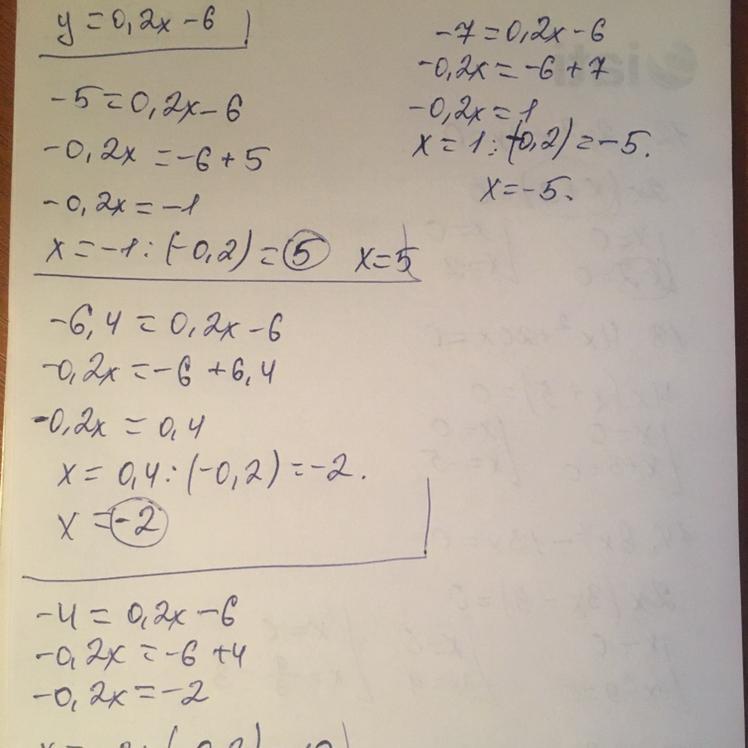 Функцію задано формулою у=0,2х-6. Знайдіть значення аргументу, якщо значення функції -5; -6,4; -4; -7