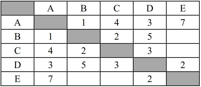 Между населёнными пунктами A, B, C, D, E построены дороги, протяжённость которых (в километрах) приведена ниже в таблице. Определите длину кратчайшего пути между пунктами A и Е, проходящего через пункт С. Передвигаться можно только по дорогам, протяжённость