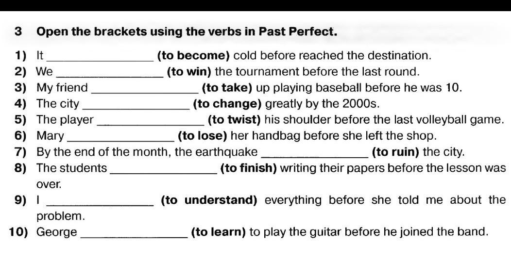 had taken,4) had changed,5)had twisted,6)had lost,7) had ruined,8)had finished, 9)had understood,10)had learnt.