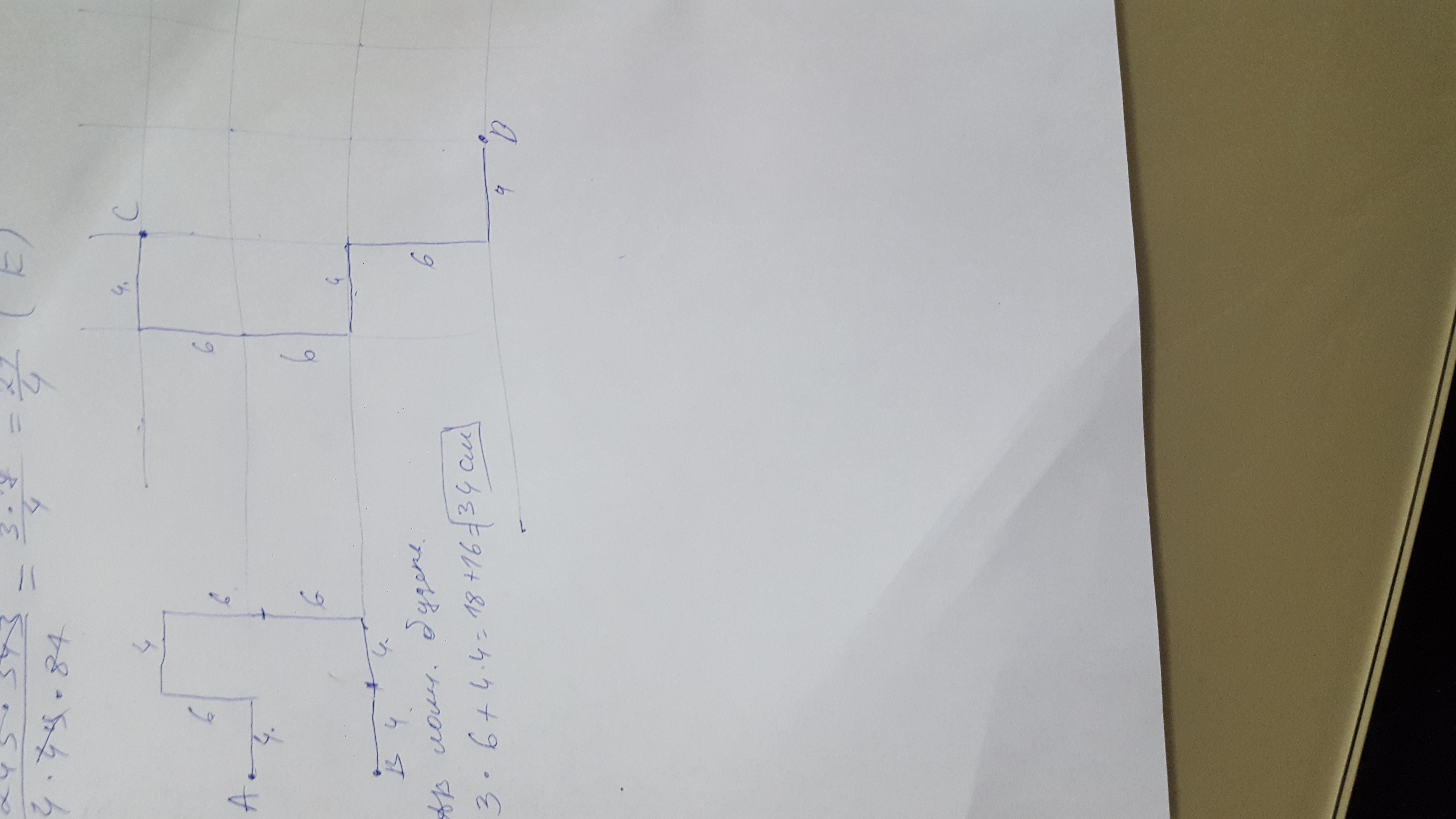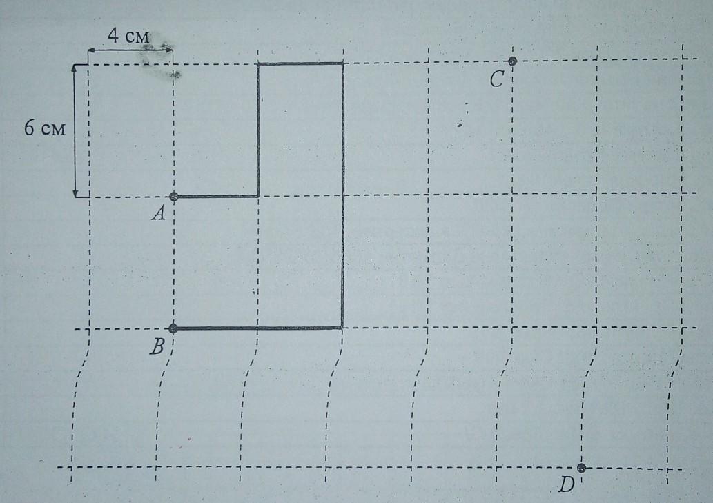 Лист бумаги расчерчен на прямоугольники со сторонами 4 см и 6 см. От точки А к точке В проведена ломаная по сторонам прямоугольников.