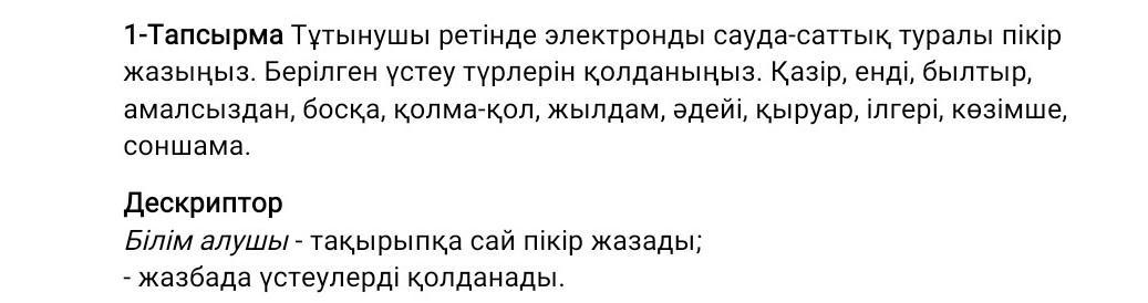 Қазір электронды түрде сауда жасау дамыған. Менде электронды түрде сауда жасаймын. Ол өте ыңғайлы, әрі жылдам. Былтыр өзіме керекті заттарды электронды сауда жасау арқылы алған болатынмын.Кез келген қалаған заттынды онлайн отырып үйден сатып ала аласын. олар саған уақытында тапсырысынды әкеледі. Өкінішке орай кейбір алаяқтар әдейі жалған сайттар ашып қыруар ақшаны ұрлап алуда. ондай сайтқа кіргенде алданып соншама ақша салып жібергенінді өзін байқамайсын,көзімше қарап отырып алданасын. Осының кесірінен адамдар босқа алданып, сан соғып қалады енді.Кейбіреуі тіпті амалсыздан ақшасын қайтара алмиай сотқа жүгінеді. Оларды тоқтату үшін заңдар күшейтілуде. Осы себепті болар көп адамдар қолма-қол сауда жасағанды дұрыс санайды. Мен ілгеріде ондай сайттардын жойылатына сенем.