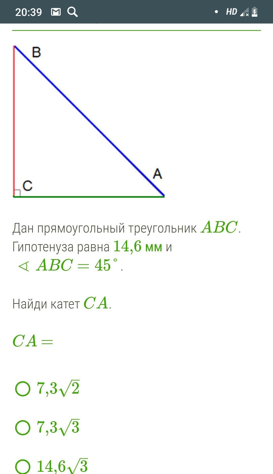∠В=∠А по свойству острых улов прямоугольного Δ.