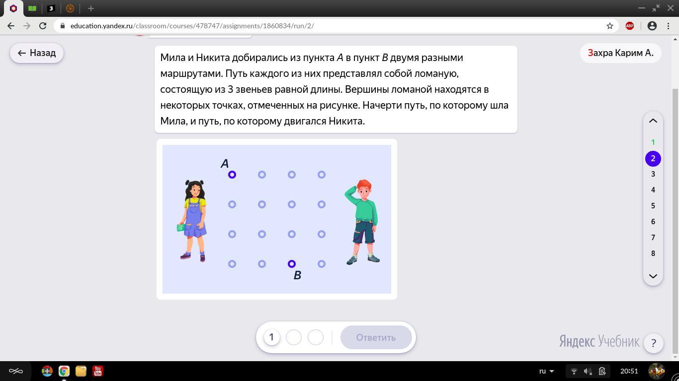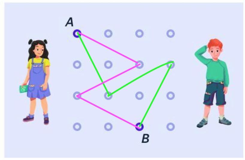 Мила и Никита добирались из пункта А в пункт В двумя разными маршрутами. Путь каждого из них представлял собой ломаную, состоящую из 3 звеньев равной длины. Вершины ломаной находятся в некоторых точках, отмеченных на рисунке. Начерти путь, по которому шла Мила, и путь, по которому двигался Никита.