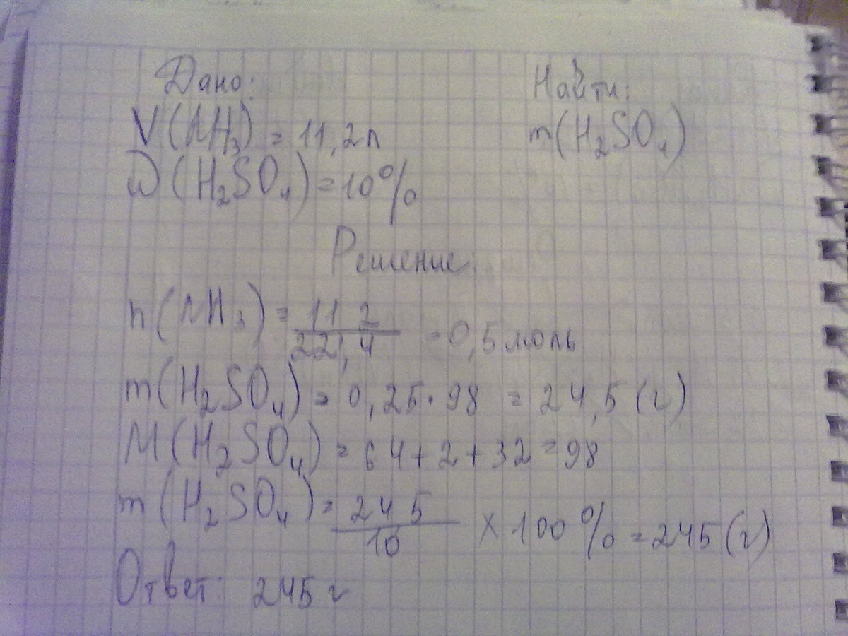 После пропускания 11,2 л (н. у.) аммиака через 10-процентный раствор сер- ной кислоты получили раствор средней соли. Определите массу исходного раствора серной кислоты.