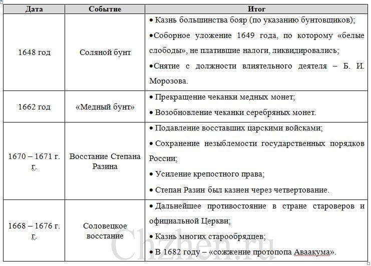 Сделать таблицу с 3 графами:дата событие итог. События:соляной бунт, медный бунт, восстание с.т.разина.,соловецкое восстание