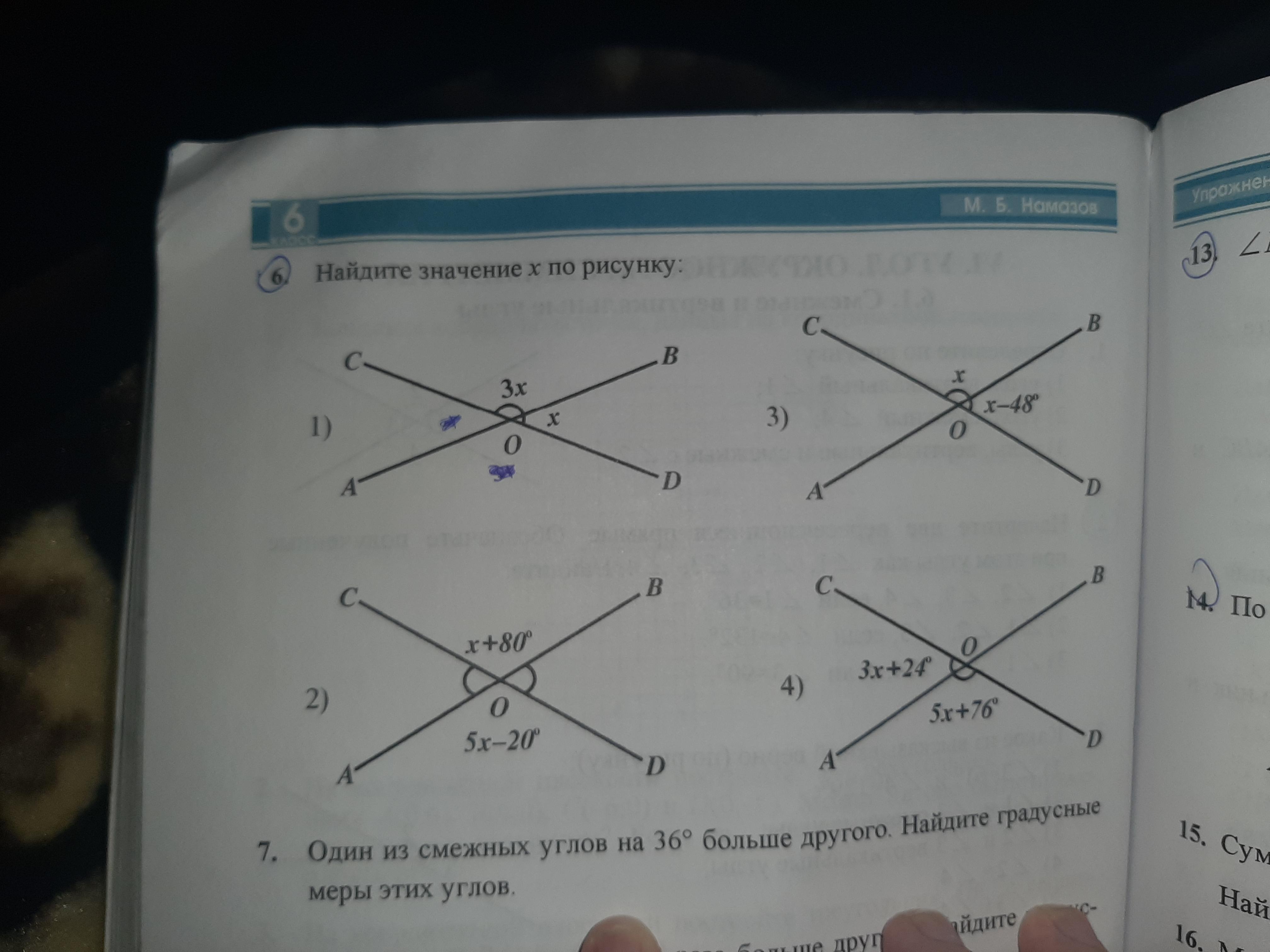 4) развернутый угол COD равен 180 или сумме углов COA + AOD = 3x + 24 + 5x + 76 = 8x + 100 т.е. 8x = 80 => x = 10