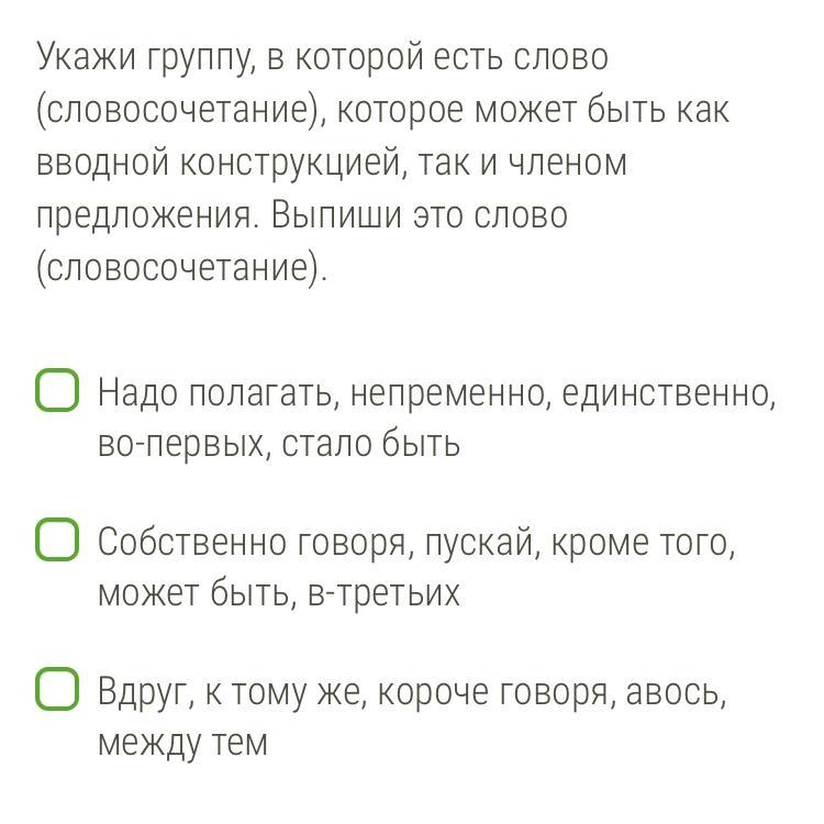 Укажи группу, в которой есть слово (словосочетание), которое может быть как вводной конструкцией, так и членом предложения. Выпиши это слово (словосочетание).