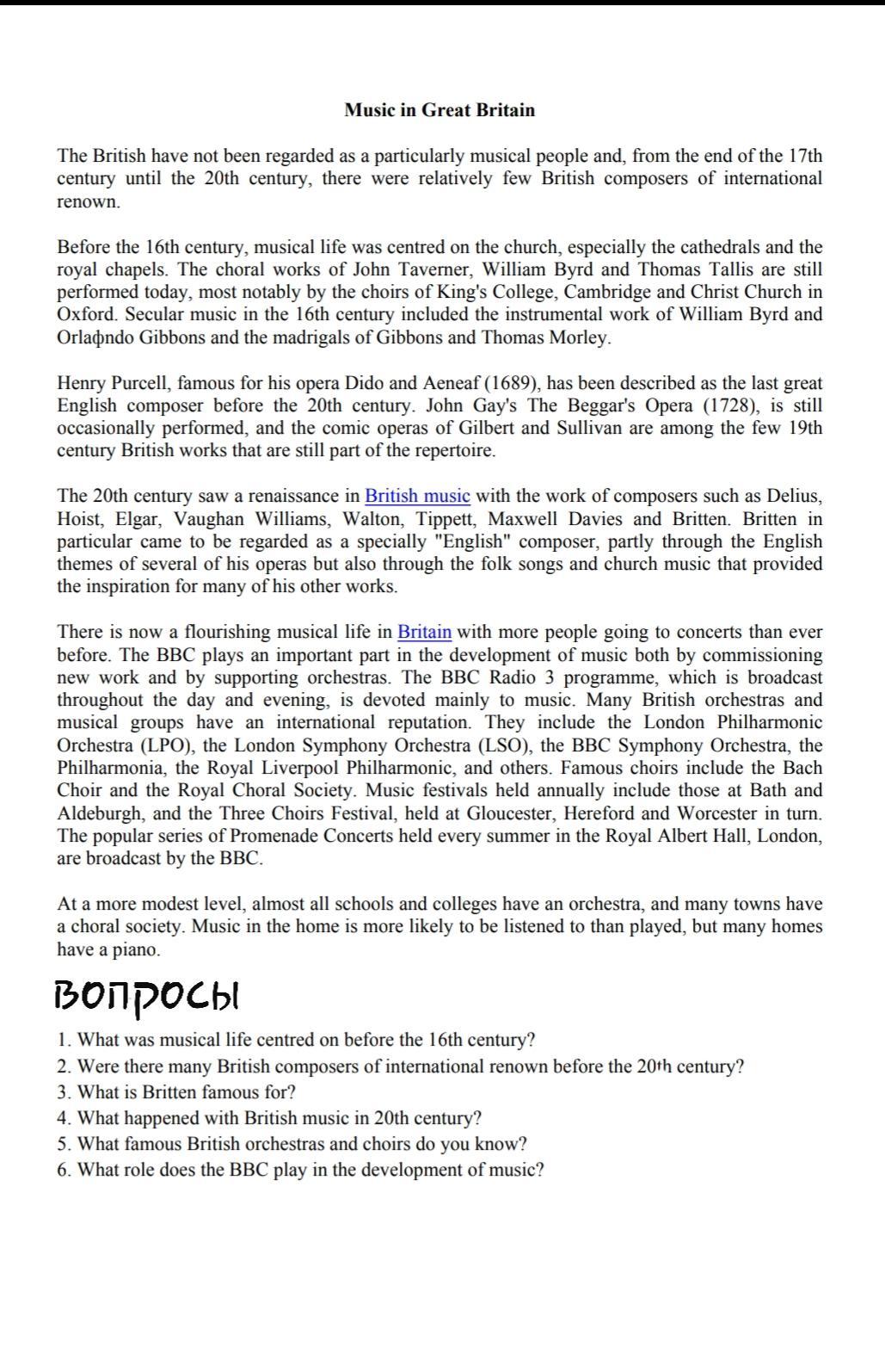 Музыка в Великобритании Британцы не считались особенно музыкальными людьми, и с конца 17-го до 20-го века британских композиторов с мировым именем было относительно немного. До 16-го века музыкальная жизнь была сосредоточена на церкви, особенно на соборах и королевских часовнях. Хоровые произведения Джона Тавернера, Уильяма Берда и Томаса Таллиса до сих пор исполняются сегодня, в первую очередь хорами Кингс-колледжа, Кембриджа и Крайст-Черч в Оксфорде. Светская музыка в 16 веке включала инструментальную работу Уильяма Берда и Орландо Гиббонса и мадригалы Гиббонов и Томаса Морли. Генри Перселл, известный своими операми «Дидона и Эниф» (1689), был описан как последний великий английский композитор до 20-го века. Опера Джона Гея «Нищий» (1728) до сих пор иногда исполняется, а комические оперы Гилберта и Салливана входят в число немногих британских произведений 19-го века, которые до сих пор являются частью репертуара. 20-й век пережил ренессанс в британской музыке с работами таких композиторов, как Делиус, Хойст, Элгар, Воган Уильямс, Уолтон, Типпетт, Максвелл Дэвис и Бриттен. В частности, Бриттен стал считаться особенно «английским» композитором, отчасти благодаря английским темам нескольких его опер, а также народным песням и церковной музыке, которые послужили источником вдохновения для многих других его произведений. Сейчас в Британии процветает музыкальная жизнь, и на концерты приходит больше людей, чем когда-либо прежде. Би-би-си играет важную роль в развитии музыки как путем ввода в эксплуатацию новых произведений, так и путем поддержки оркестров. Программа BBC Radio 3, которая транслируется днем и вечером, в основном посвящена музыке. Многие британские оркестры и музыкальные группы имеют международную репутацию. Они включают в себя Лондонский филармонический оркестр (LPO), Лондонский симфонический оркестр (LSO), Симфонический оркестр BBC, Филармонию, Королевскую ливерпульскую филармонию и другие. Известные хоры включают Хор Баха и Королевское хоровое общество. Ежегодно проводятся музыкальные фестивали, в том числе в Бате и Олдебурге, а также фестиваль «Три хора», который проводится по очереди в Глостере, Херефорде и Вустере. BBC транслирует популярную серию Променадных концертов, проводимых каждое лето в Королевском Альберт-Холле в Лондоне. На более скромном уровне почти во всех школах и колледжах есть оркестр, а во многих городах есть хоровое общество. В домашних условиях музыку чаще слушают, чем играют, но во многих домах есть пианино.