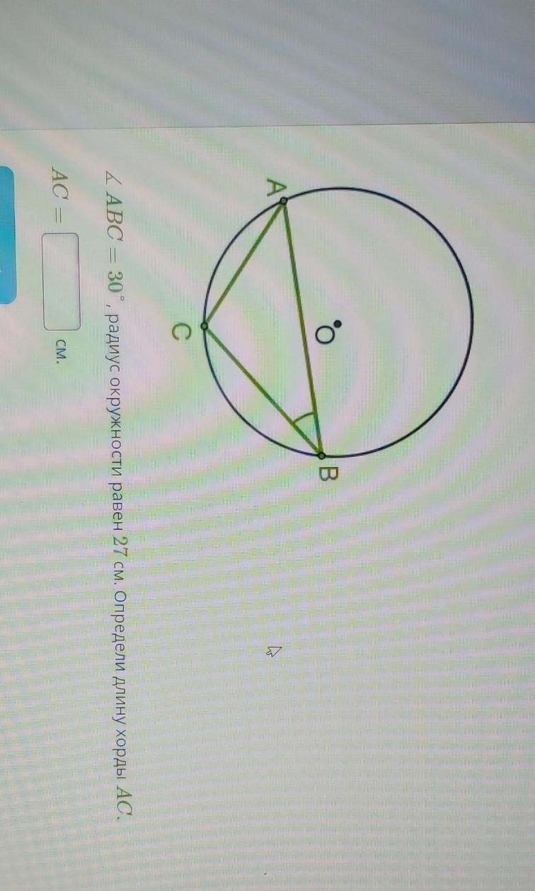 Угол AOC — центральный, он опирается на ту же дугу, что и ABC, а значит АОС в 2 раза больше, АОС =60°
