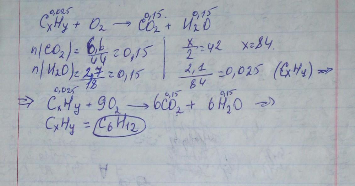 При сгорании 2,1 г вещества получили 6,6 г СО2 и 2,7 г воды. Определите молекулярную формулу вещества. D (H2) = 42