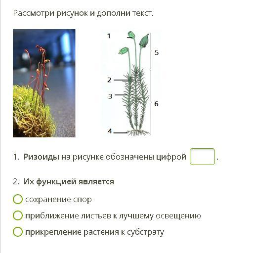 Ризоиды находятся под цифрой 4, их функцией является прикрепление растения к субстрату.