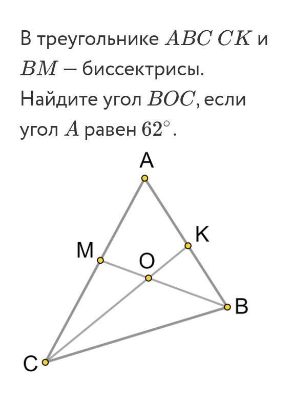 ∠ОСВ+∠ОВС=118°:2=59° (СК и ВМ - биссектрисы)