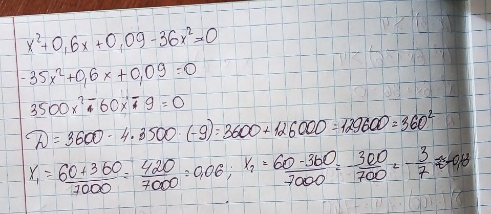 Всем привет! Реши уравнение x²+0,6x+0,09-36x²=0