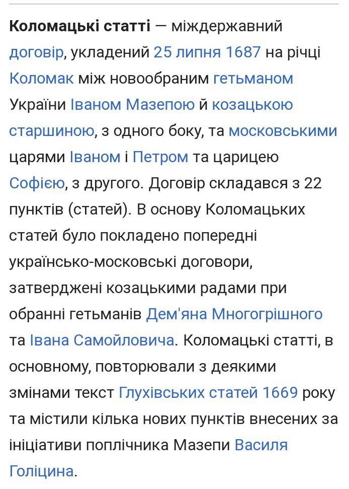 Коломацькі статті — міждержавний договір, укладений 25 липня 1687 на річці Коломак між новообраним гетьманом України Іваном Мазепою й козацькою старшиною, з одного боку, та московськими царями Іваном і Петром та царицею Софією, з другого. Договір складався з 22 пунктів (статей). В основу Коломацьких статей було покладено попередні українсько-московські договори, затверджені козацькими радами при обранні гетьманів Дем'яна Многогрішного та Івана Самойловича. Коломацькі статті, в основному, повторювали з деякими змінами текст Глухівських статей 1669 року та містили кілька нових пунктів внесених за ініціативи поплічника Мазепи Василя Голіцина.