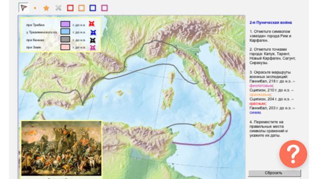 Город Сиракузы на ходится снизу острова "Сицилия" там даже точка есть чуть ниже того места где Сицилия почти касается полуострова (можно найти на современной карте, этот город до сих пор существует). Город "Карфаген" находится чуть выше фиолетового маршрута- там две точки- он та которая снизу. Рим- Найди на современной карте так проще будет. Город "Тарент" находится в точке где кончается фиолетовый маршрут. Город "Сагунт" находится с противоположной стороны полуострова на берегу Адриатического моря, прямо противоположно Риму(если что сейчас это город Сан-Марино). Капуя находится в точке ниже Рима. Новый Карфаген находится в точке где расходятся два серых маршрута(в левой части). А вообще поиграй в кампанию игры TotalWarRome2 там идеально воссоздана карта всего средиземноморья и именно из этой игры я и узнал все это.