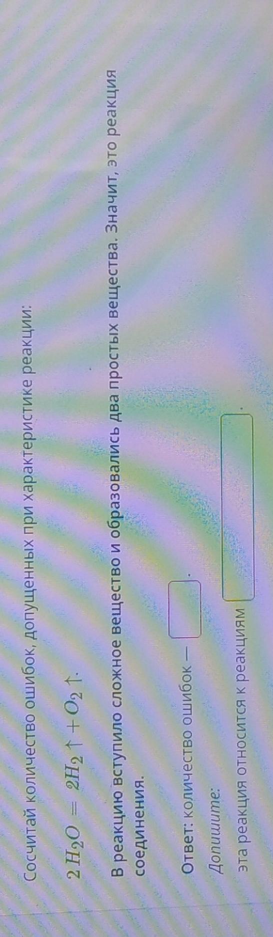 Сосчитай количество ошибок ,допущенных при характеристике реакции: 2 H2O=2H2(стрелка вверх)+O2(стрелка вверх)