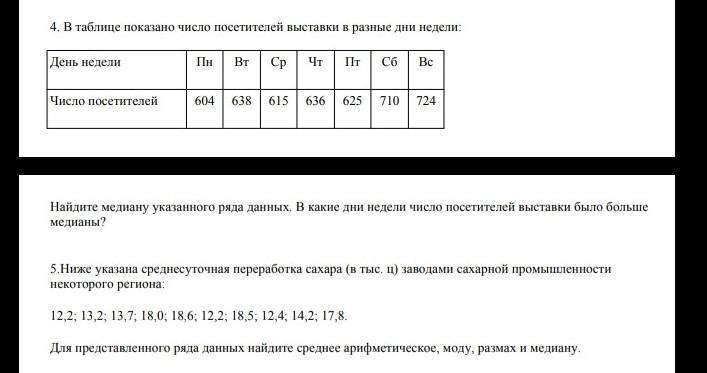 Пошаговое объяснение:1) У ас число посетителей нечётно, , поэтому медиана ряда равна 636. Во вторник (638) и в субботу (710) посетителей было больше медианы. 2) Размахом ряда чисел называется разность между наибольшим и наименьшим из этих чисел. Наибольшее число 17,8, наименьшее 12,2, значит размах равен 17,8-12,2 =5,6 Средним арифметическим ряда чисел называется частное от деления суммы этих чисел на число слагаемых. Сумма чисел равна 12,2+13,2+13,7+18+18,6+12,2+18,5+12,4+14,2+17,8= 150,8 ; число членов равно 10, значит среднее арифметическое равно 150,8 : 10 = 15,08 Модой ряда чисел называется число, которое встречается в данном ряду чаще других , значит это число 12,2 Медианой упорядоченного ряда чисел с нечётным числом членов называется число, записанное посередине, а медианой упорядоченного ряда чисел с чётным числом членов называется среднее арифметическое двух чисел, записанных посередине. У нас: (18,6+12,2):2 =15,4
