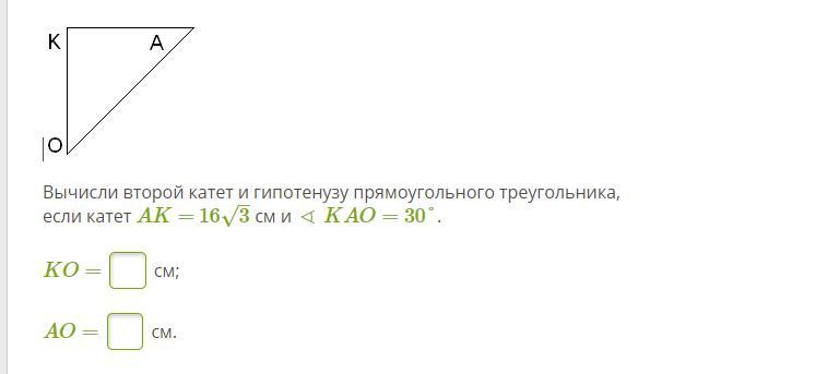 4х²-х²=16²*3⇒х²=16², т.к. х- положительная величина, то х=16, значит, катет КО = 16 см, тогда гипотенуза АО=2*16=32 см.