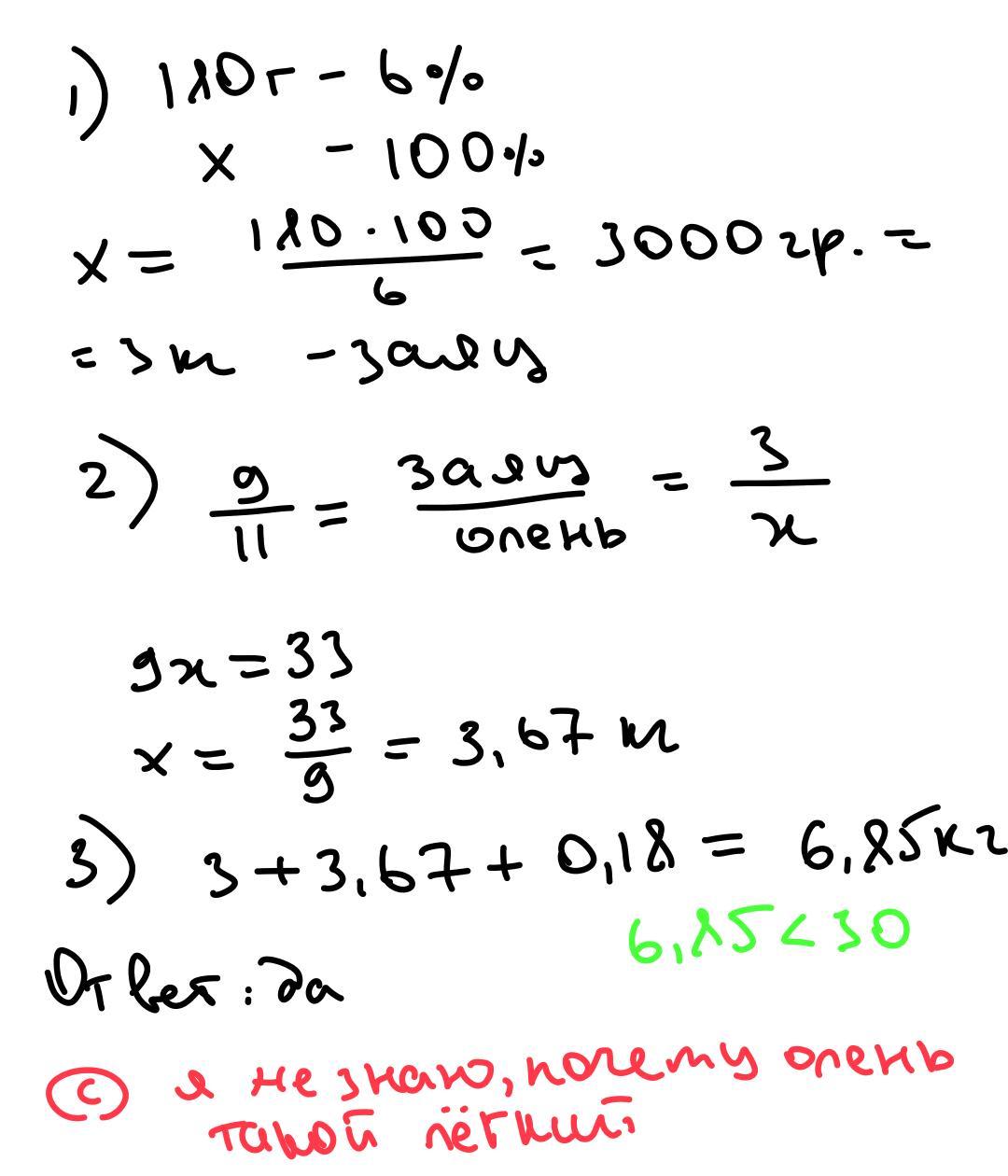 Белочка, зайчонок и оленёнок сделали лодку грузоподъёмностью 30 кг. Масса зайчонка равна 9/11 массы оленёнка, а масса белочки составляет 6% от массы зайчонка. Могут ли они вместе отправится по реке на своей лодке, если масса белочки равна 180 г?