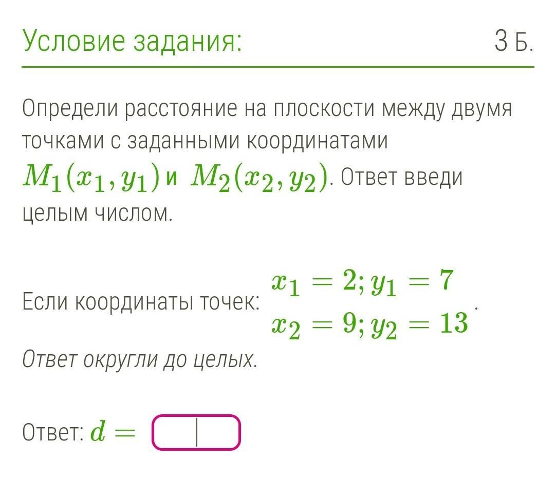 d=корень ((x2-x1)^2+(y2-y1)^2)=корень((9-2)^2+(13-7)^2)=корень(49+36)=корень(85)=9