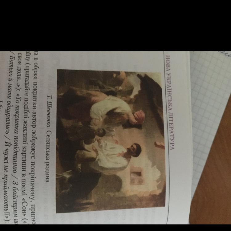 Ответ::Проста селянська родина.Вже день підходить к кінцю.Голова родини задумався,а мати тормошить його,бо вечеря готова.Маленький хлопчик виглядає спокійним,сумирним,як отець.