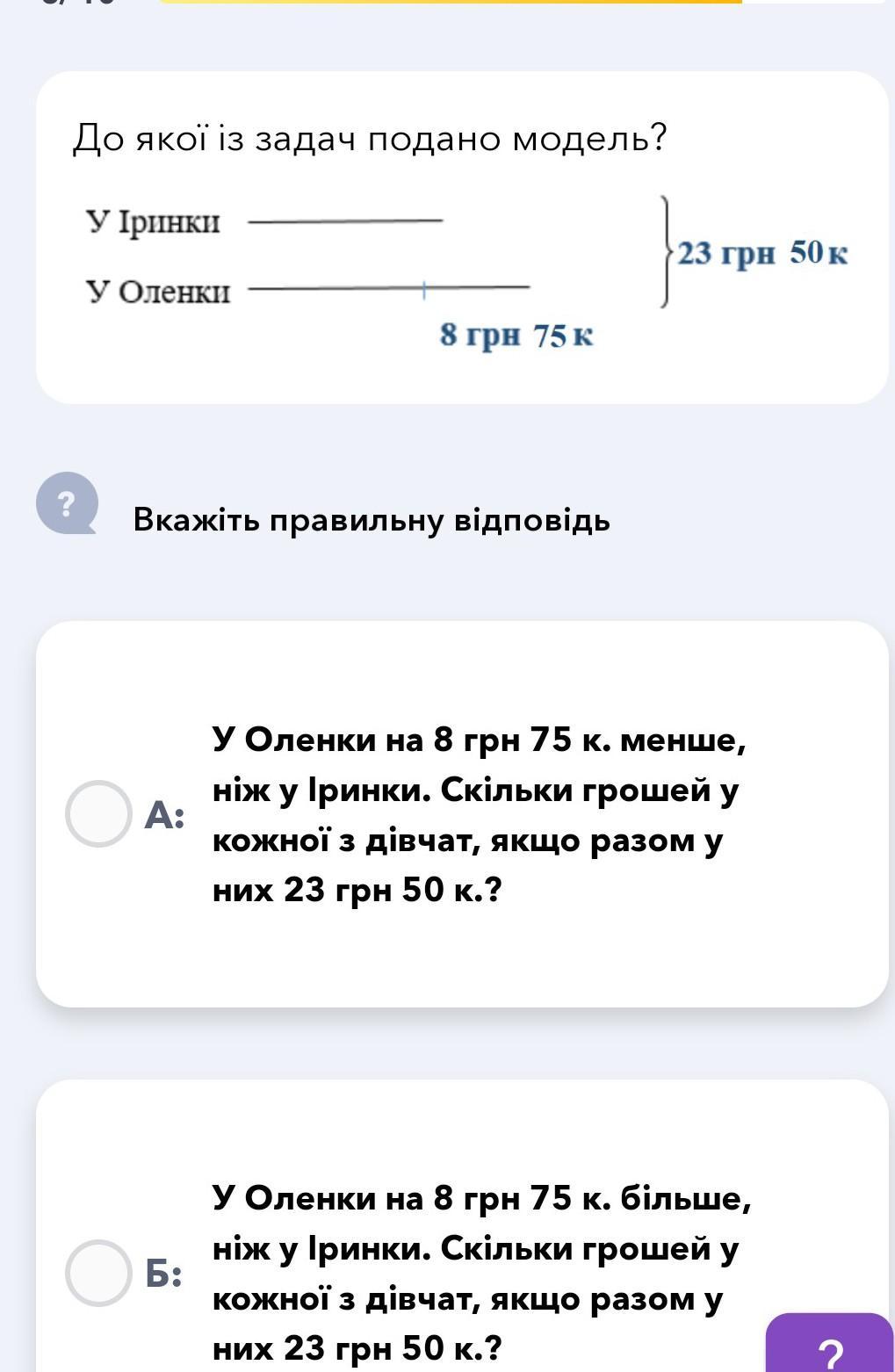 Г:У Оленкы на 8 грн 75 к, бильше ниж у Ирынкы. Скилькы грошей у Оленкы, якщо у Иринкы 23 грн 50 к.?