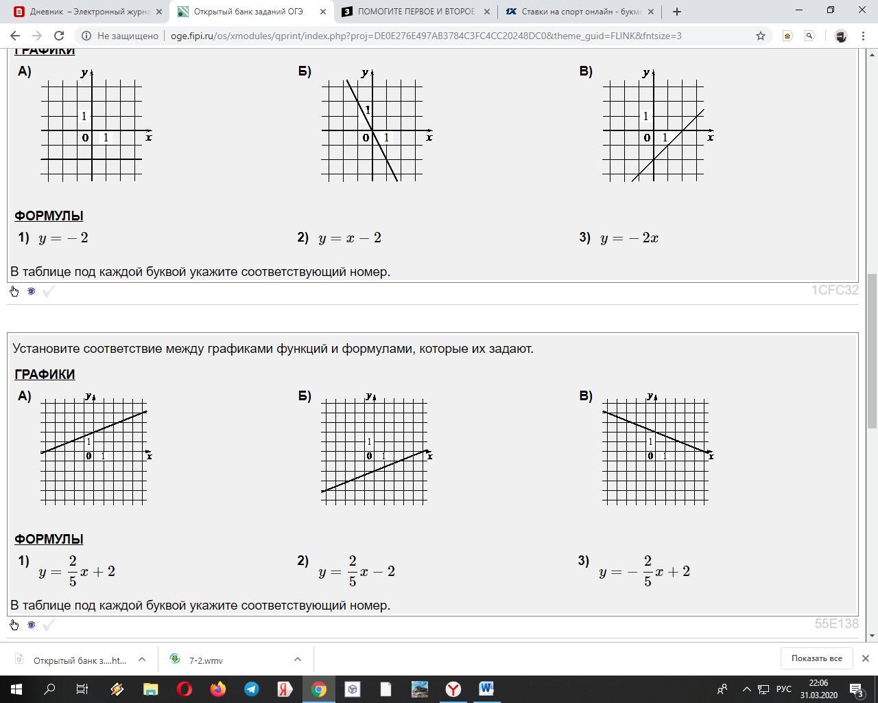 Рассмотрим графики А, Б и В. Заметим, что график В принципиально отличается от графиков А и Б наклоном прямой. За наклон отвечает число перед x. В вариантах ответа 1 и 2 такие числа одинаковые: 2/5. Значит сразу понятно соответствие B-3. Рассмотрим графики А и Б. Они отличаются тем, что один из них выше другого. За это отвечает число b, (если y=kx+b). Т.е. мы смотрим на число без буквы x. Там, где оно со знаком +, это график А, где со знаком -, то это график Б.